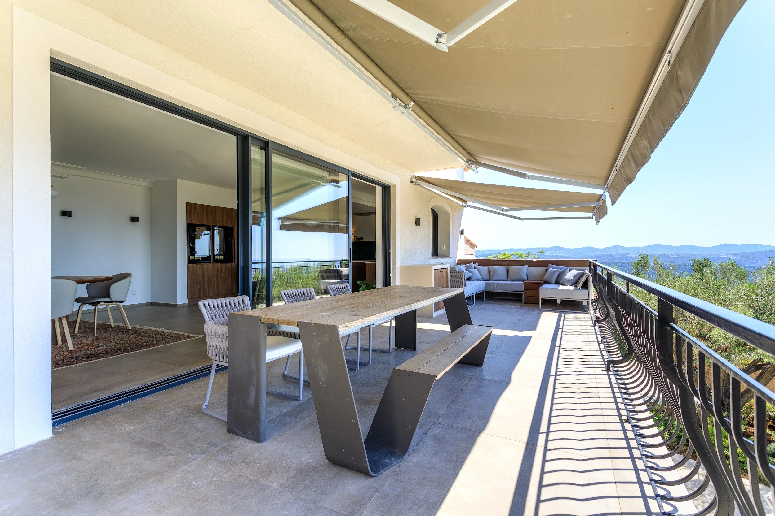 De oude steenconstructie is ondervangen en vervangen door een vijf meter breed aluminium kozijn, waardoor een open en lichte ruimte is ontstaan. Op de aangrenzende vlonder is een buitenkeuken gerealiseerd, perfect geïntegreerd in het ontwerp van de buitenruimte.